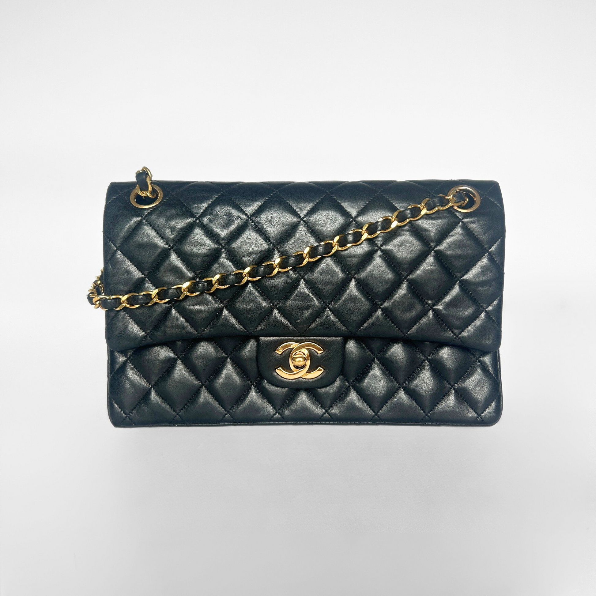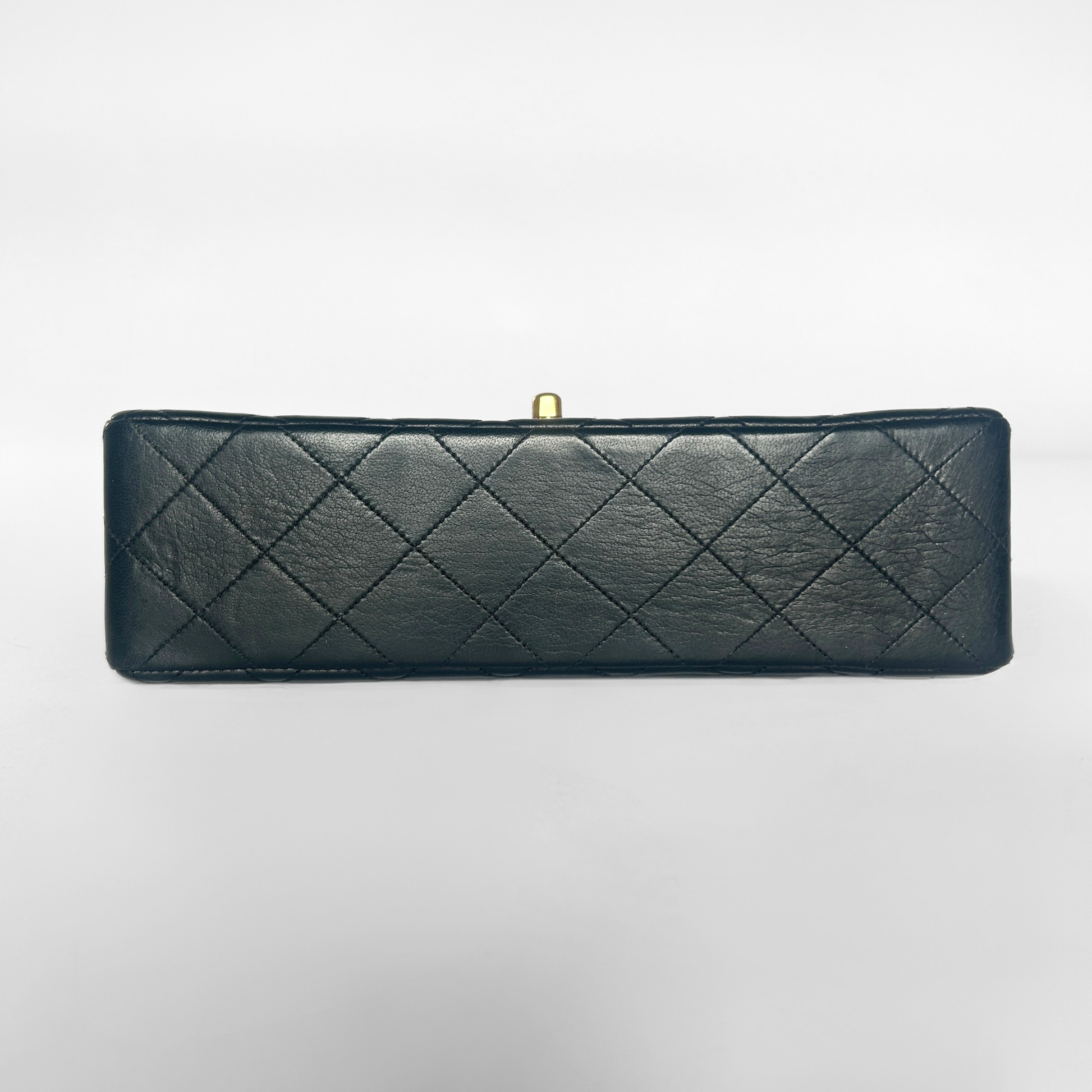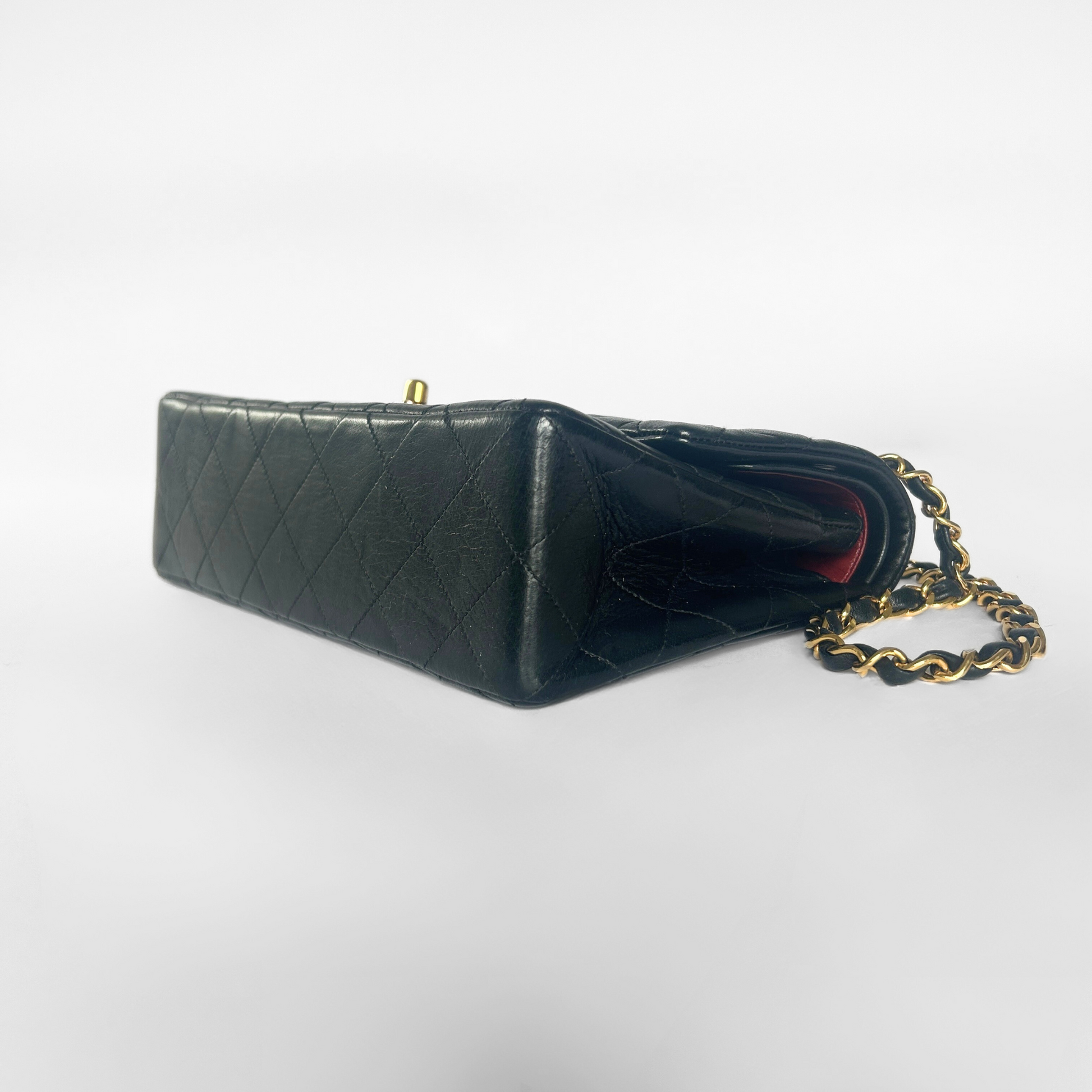 Chanel Classic Flap Bag er i en mellemstørrelse i sort lammeskind. Chanel Classic Double Flap er en af de mest ikoniske håndtasker, der nogensinde er skabt og er i årtier blevet betragtet som et symbol på tidløs stil og elegance. Navnet “Double Flap” refererer til taskens geniale design, hvor der er en ekstra flap foran, der dækker lynlåsen. Tasken er lavet af højkvalitets læder og har en markant quiltningsteknik, der giver den et luksuriøst look. Taskens hardware er forgyldt med 24K guld, hvilket er meget sjældent, da dette ikke længere produceres på denne måde i disse dage.