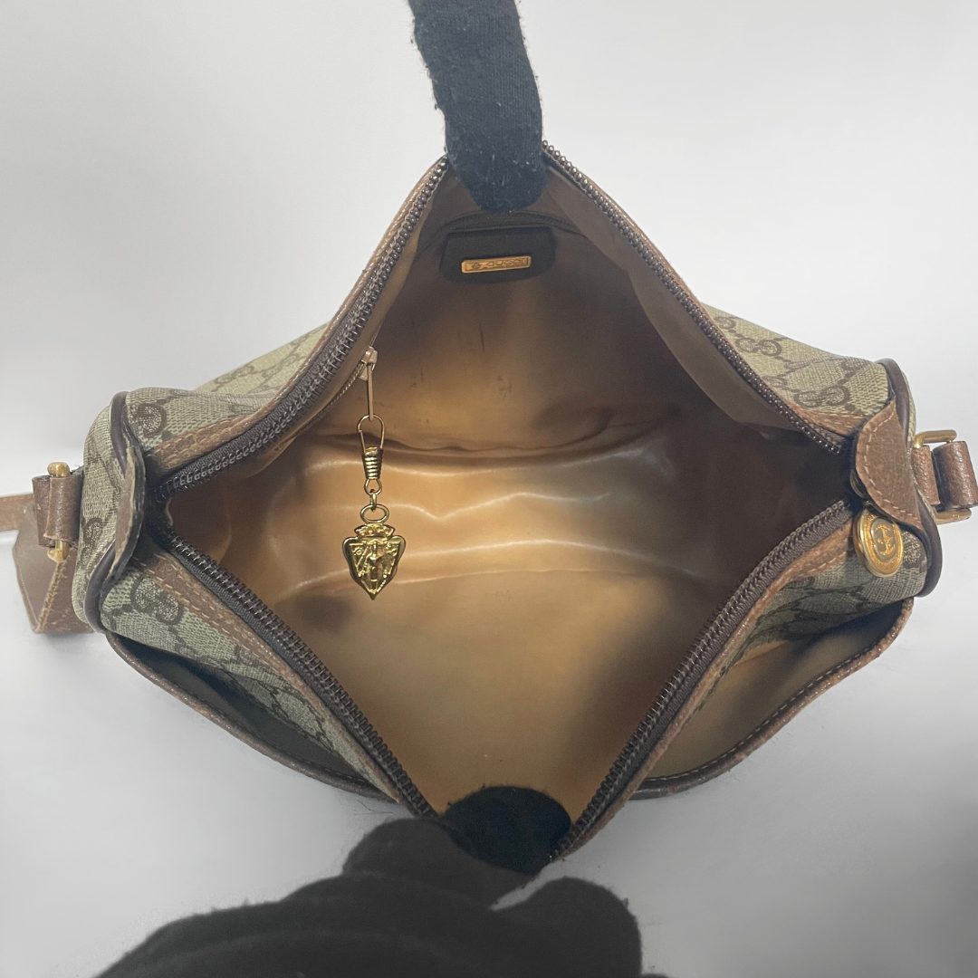 Gucci Crossbody taske i Monogram Canvas med brune læderdetaljer. Denne Gucci Crossbody-taske med Monogram Canvas har mode og funktionalitet samlet i én. Med sin klassiske form og rummelige kapacitet er den perfekt som hverdagstaske. Remmen gør tasken bærbar som crossbody-taske.